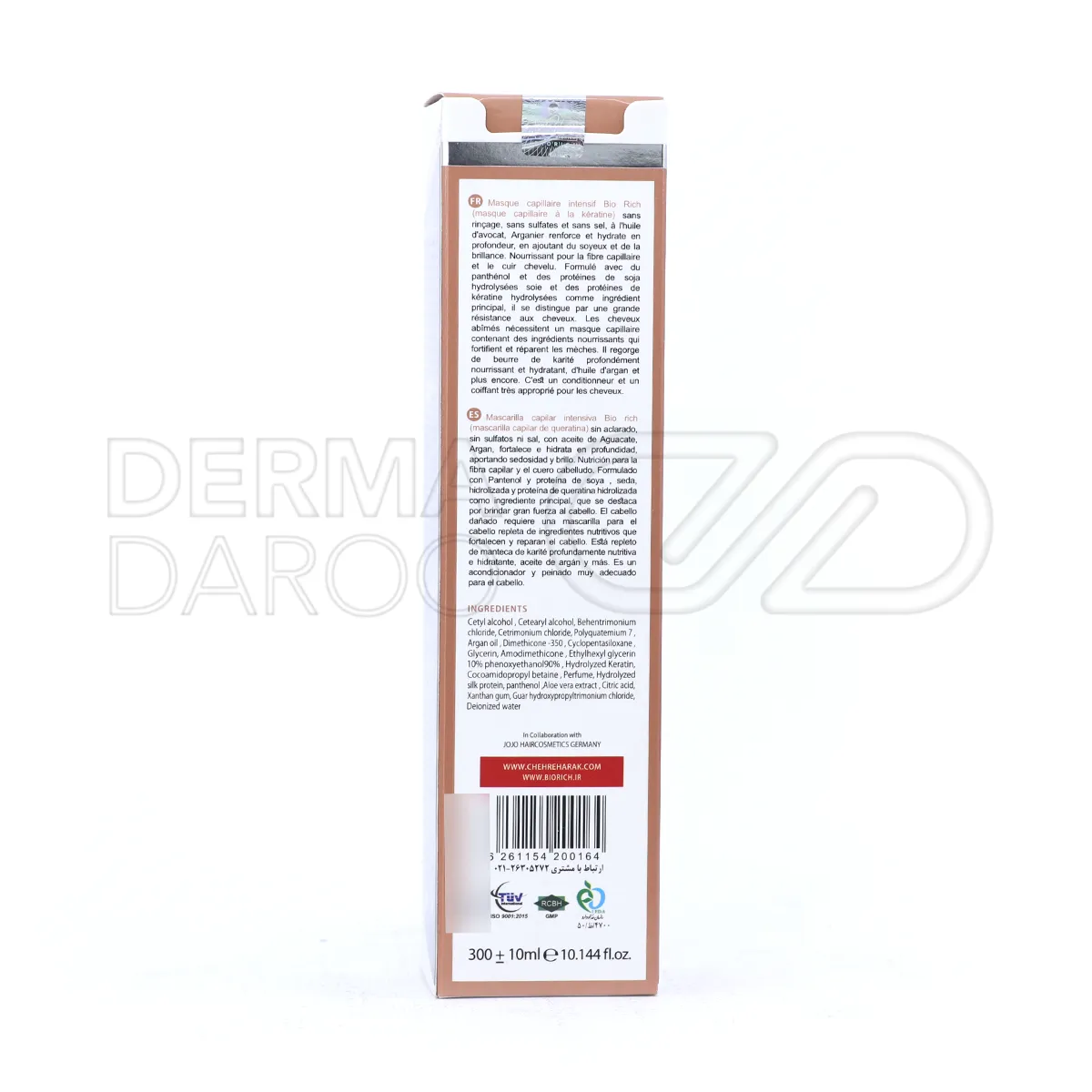 ماسک مو کراتین بایوریچ با آلوئهورا و روغن آرگان، موهای آسیبدیده را بازسازی و نرم میکند، فاقد سولفات و پارابن