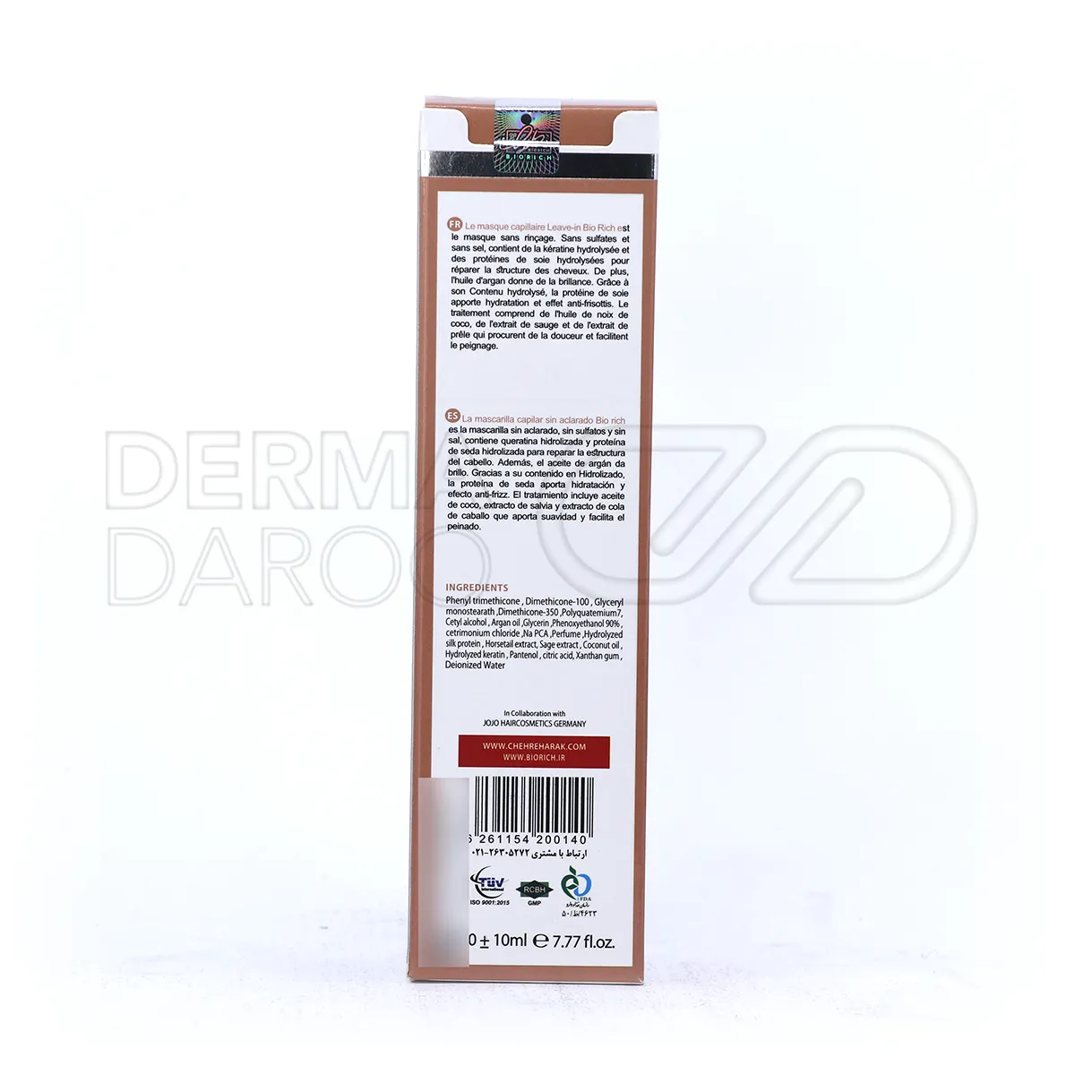ماسک مو پروکراتین بایوریچ بدون آبکشی فاقد سولفات، نمک، پارابن و سیلیکون ،حاوی عصارهای روغن نارگیل، عصاره مریم گلی و عصاره دم اسبی و روغن آرگان می باشد که برای نرمی و بازسازی موهای آسیب دیده مانند موهای کراتینه و دکلره شده و خشک مناسب می باشد.