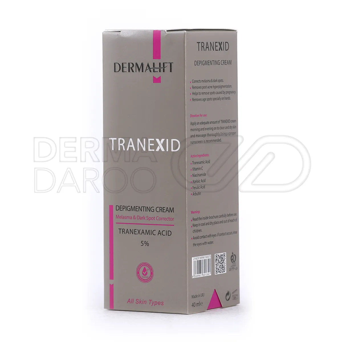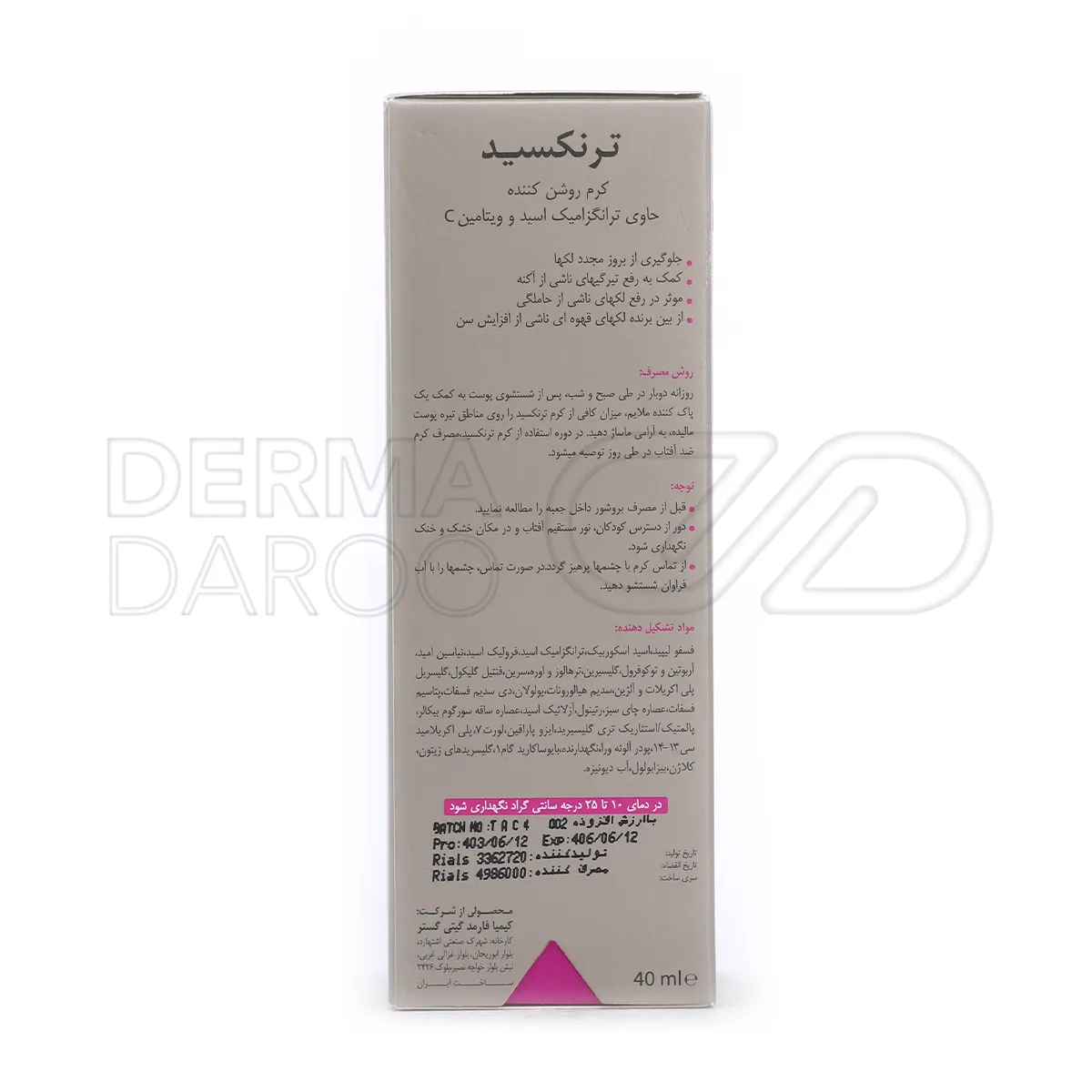کرم روشن کننده ترنکسید درمالیفت ۴۰ میلی لیتر، حاوی ترانگزامیک اسید و ویتامین C می باشد که لکه های قهوه ای ناشی از افزایش سن، قرار گرفتن در برابر آفتاب، لک های حاملگی را از بین برده و از بروز مجدد لک بر روی پوست جلوگیری می کند.