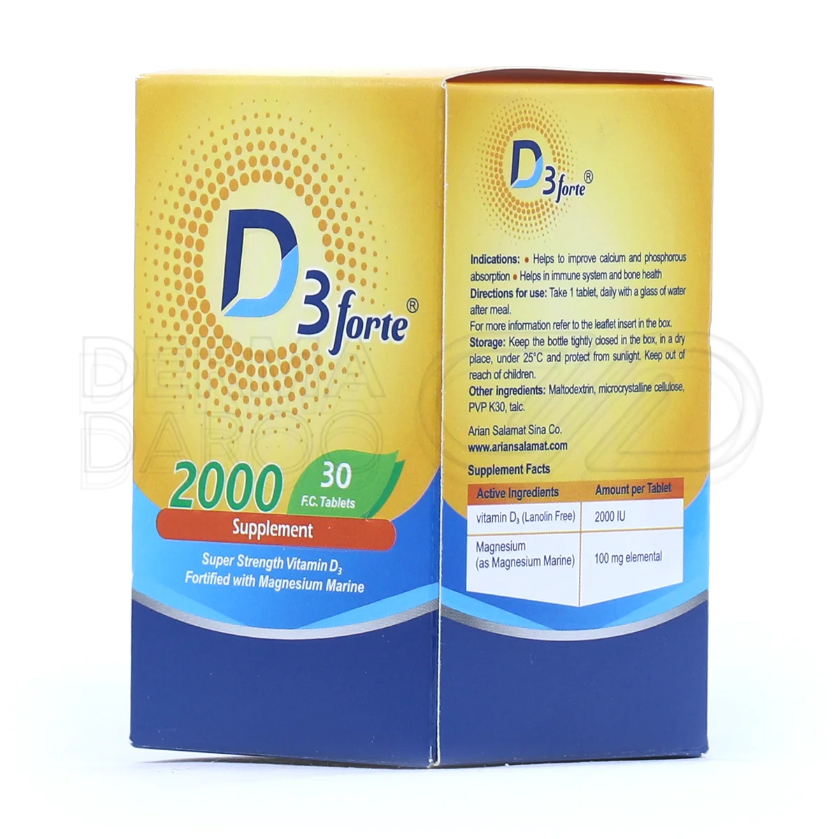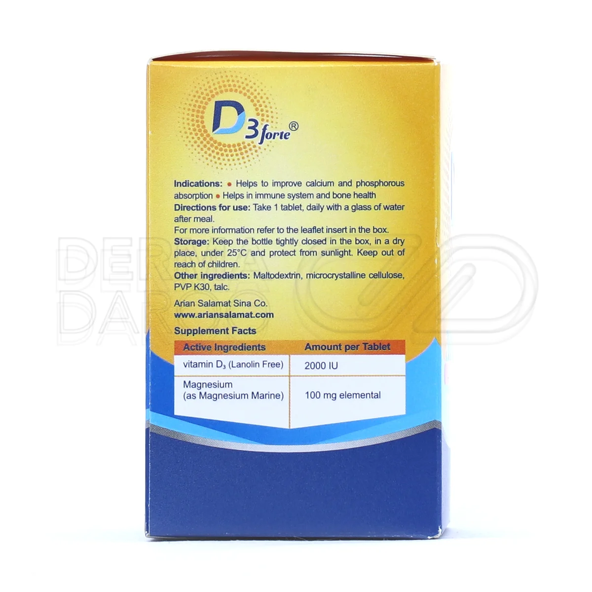 دی ۳ فورت ۲۰۰۰ میلی گرم (ویتامین د + منیزیم) آرین سلامت سینا دارای ویتامین D3 وغنی شده با منیزیم دریایی است. ویتامین D3 در پوست بدن با استفاده از اشعه فرابنفش خورشید ساخته می شود. ویتامین D اصلی ترین تنظیم کننده کلسیم در بدن، که در تکامل اسکلتی و محکم شدن استخوان ها نقش بسیار مهمی دارد.