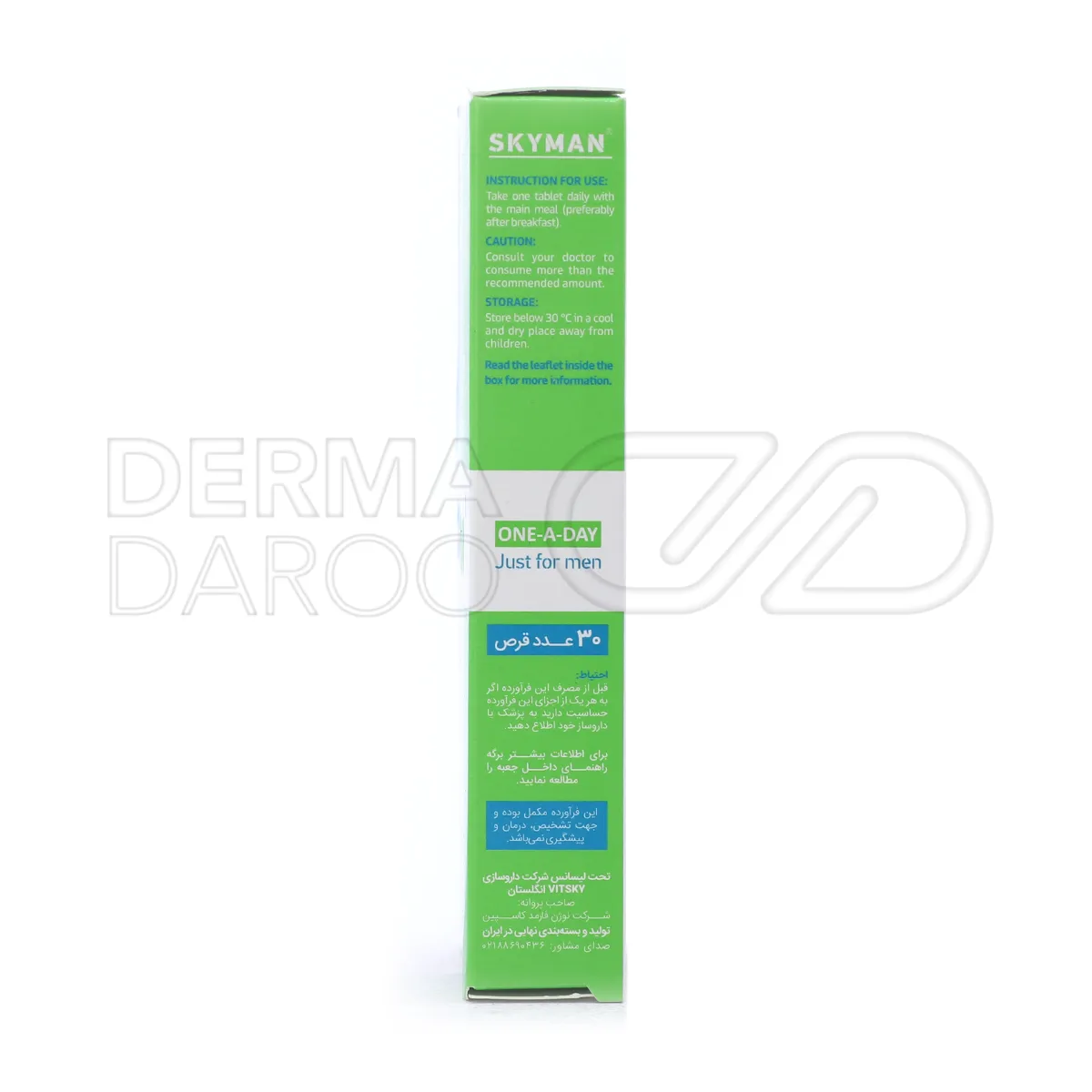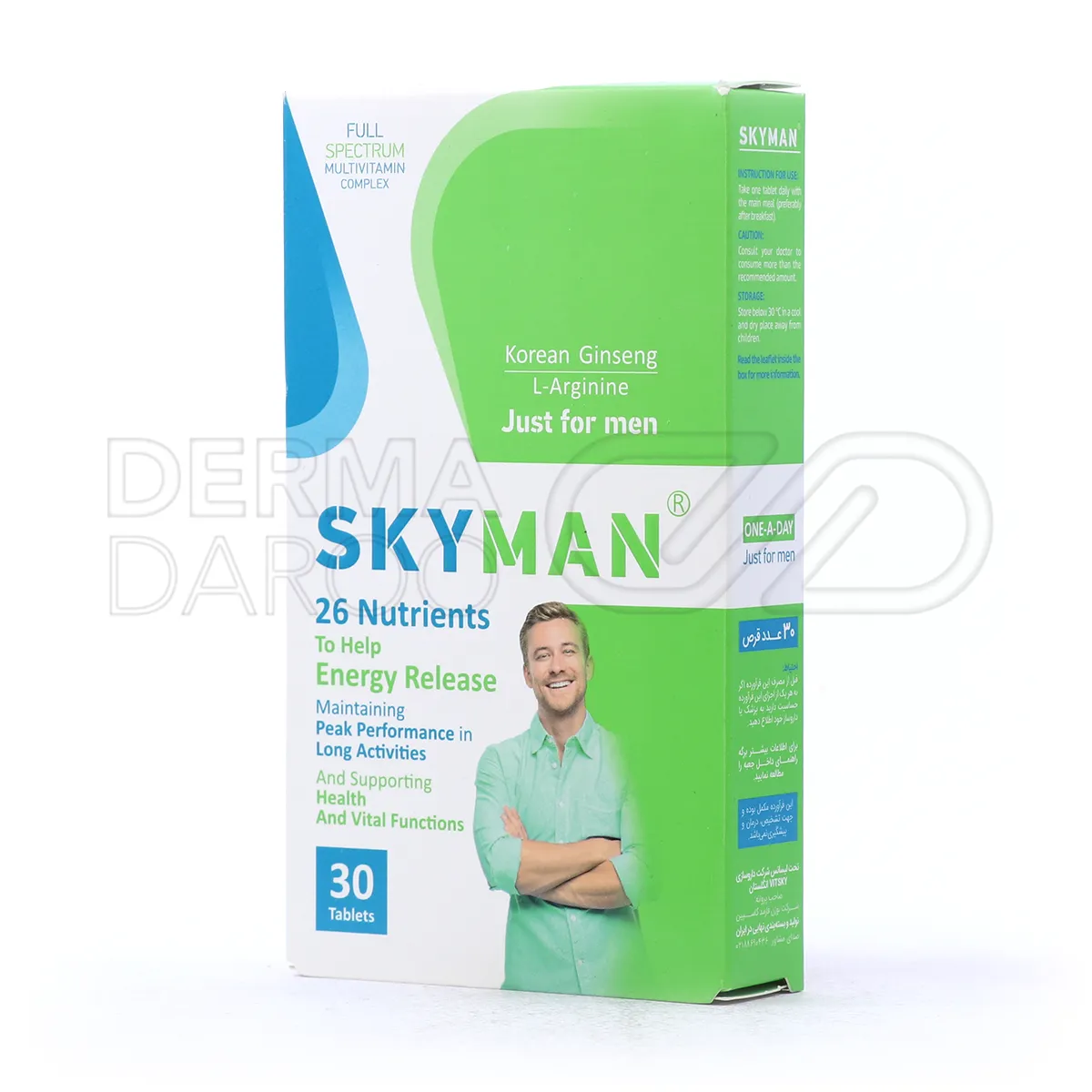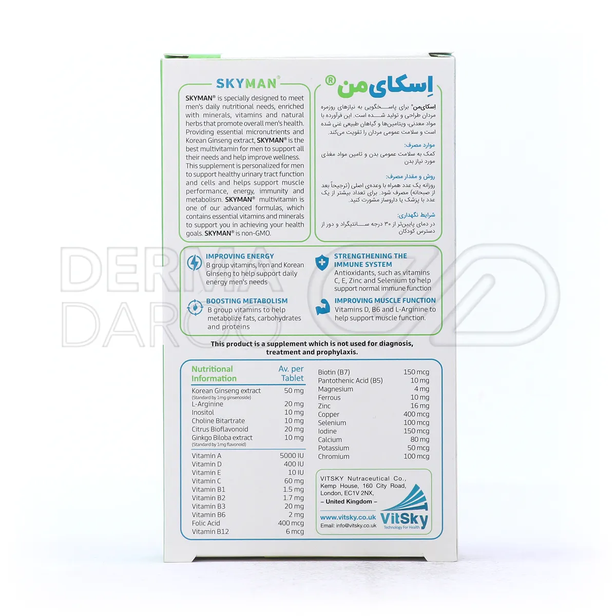 اسکای من (مولتی ویتامین آقایان) ویت اسکای ۳۰ قرص Sky Man Vit Sky 30Tabs، حاوی ویتامینA ،D ،E ،C و ال آرژنین و جینسینگ کره ای می باشد. مکمل اسکای من ویت اسکای با دارا بودن مواد مغذی و ویتامین ها به سلامت عمومی آقایان کمک کرده و همچنین با تقویت سیستم ایمنی از استرس اکسیداتیو در عروق و شریانهای خون و بافتهای آلت تناسلی مردان جلوگیری نماید. همچنین با توجه به ترکیبات منحصر به فرد خود منجر به تقویت قوای جنسی، سلامت پروستات، افزایش متابولیسم پایه و قدرت عضلانی میشود.